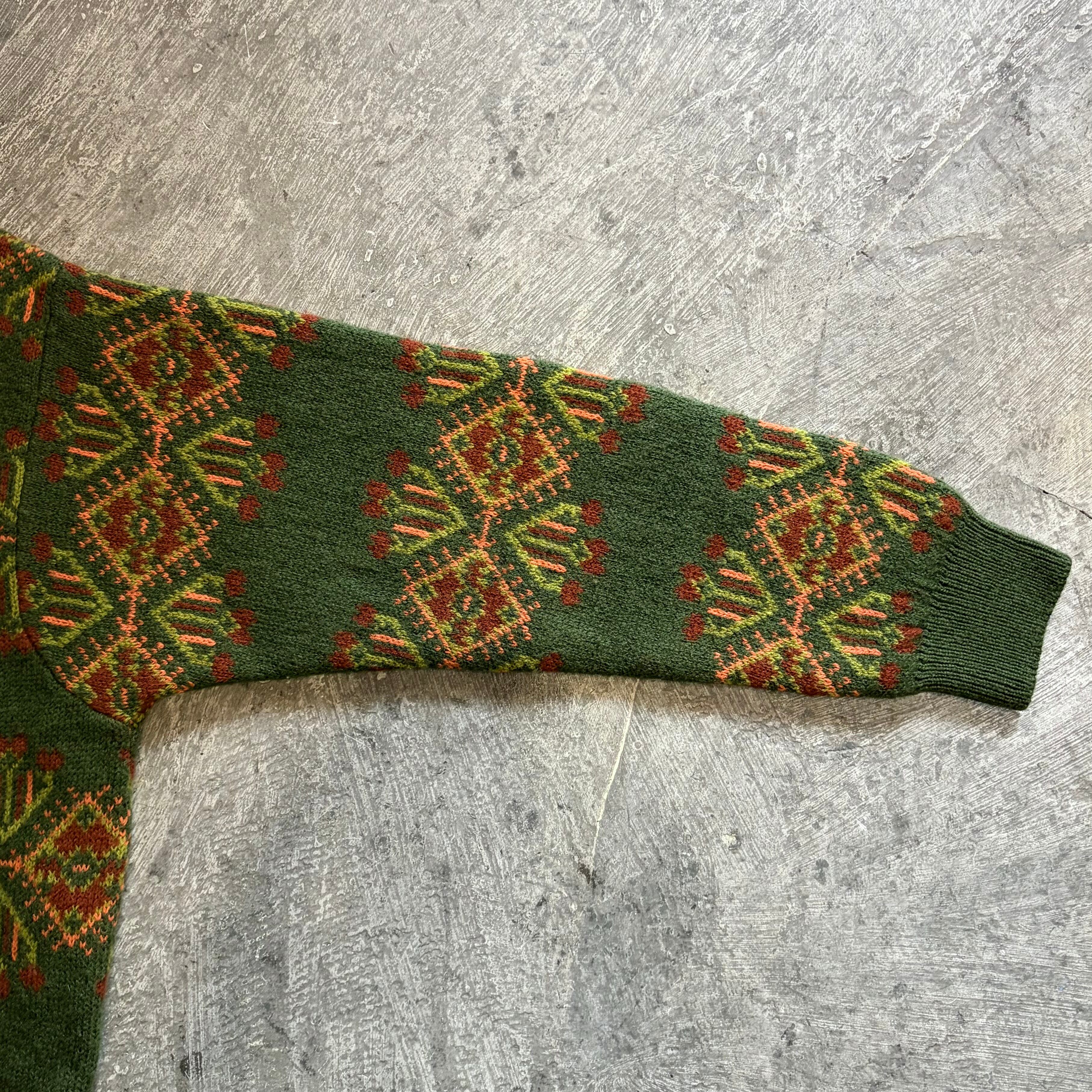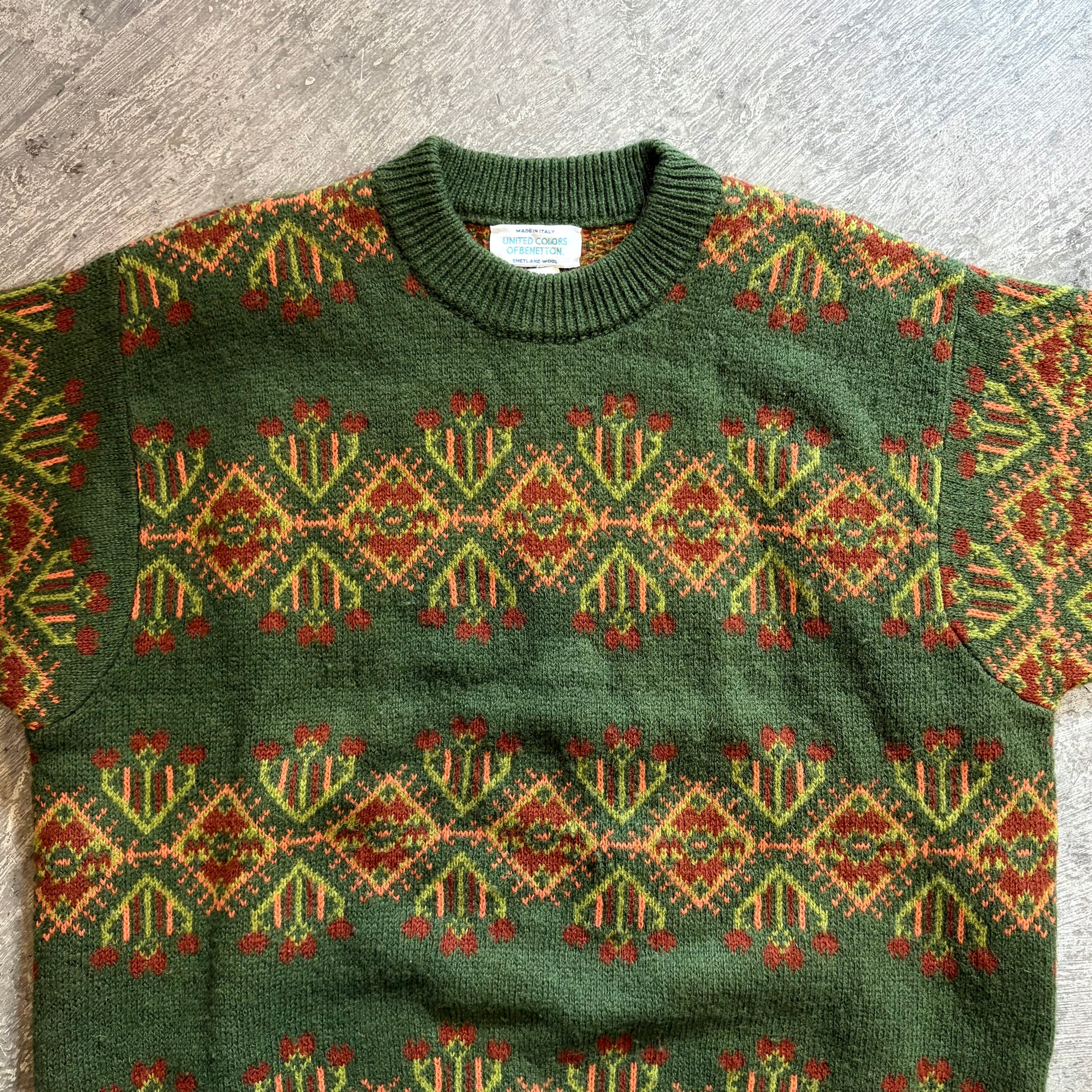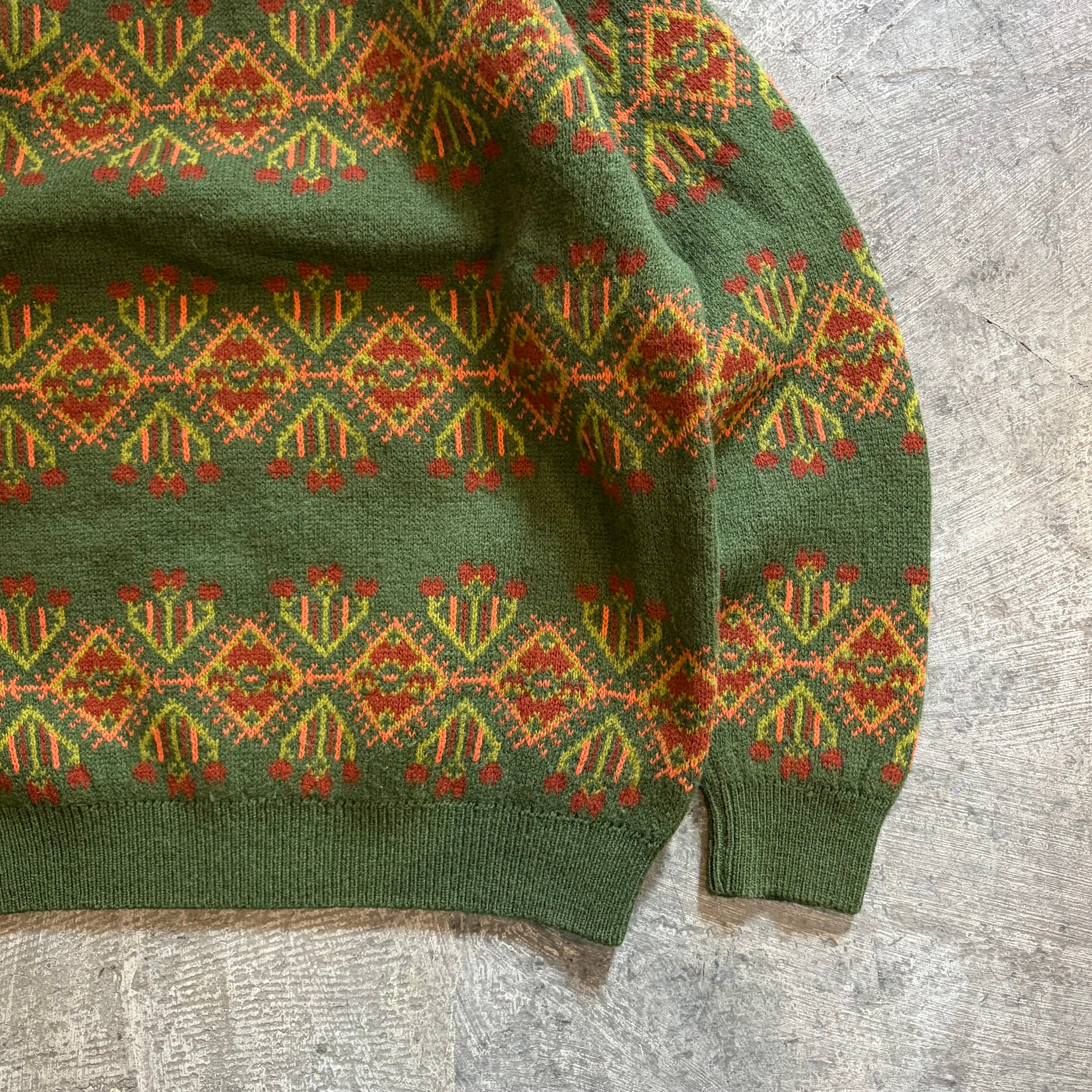 落ち着いた緑に鮮やかなオレンジのカラーが可愛いイタリア製のニットセーターです