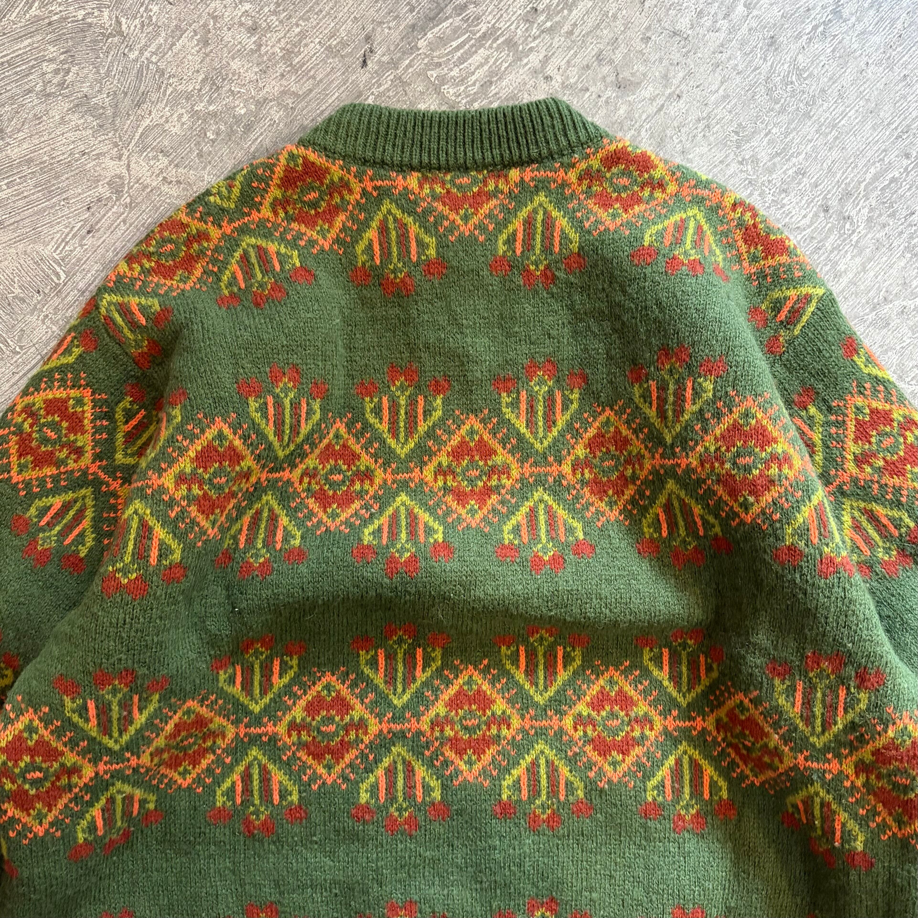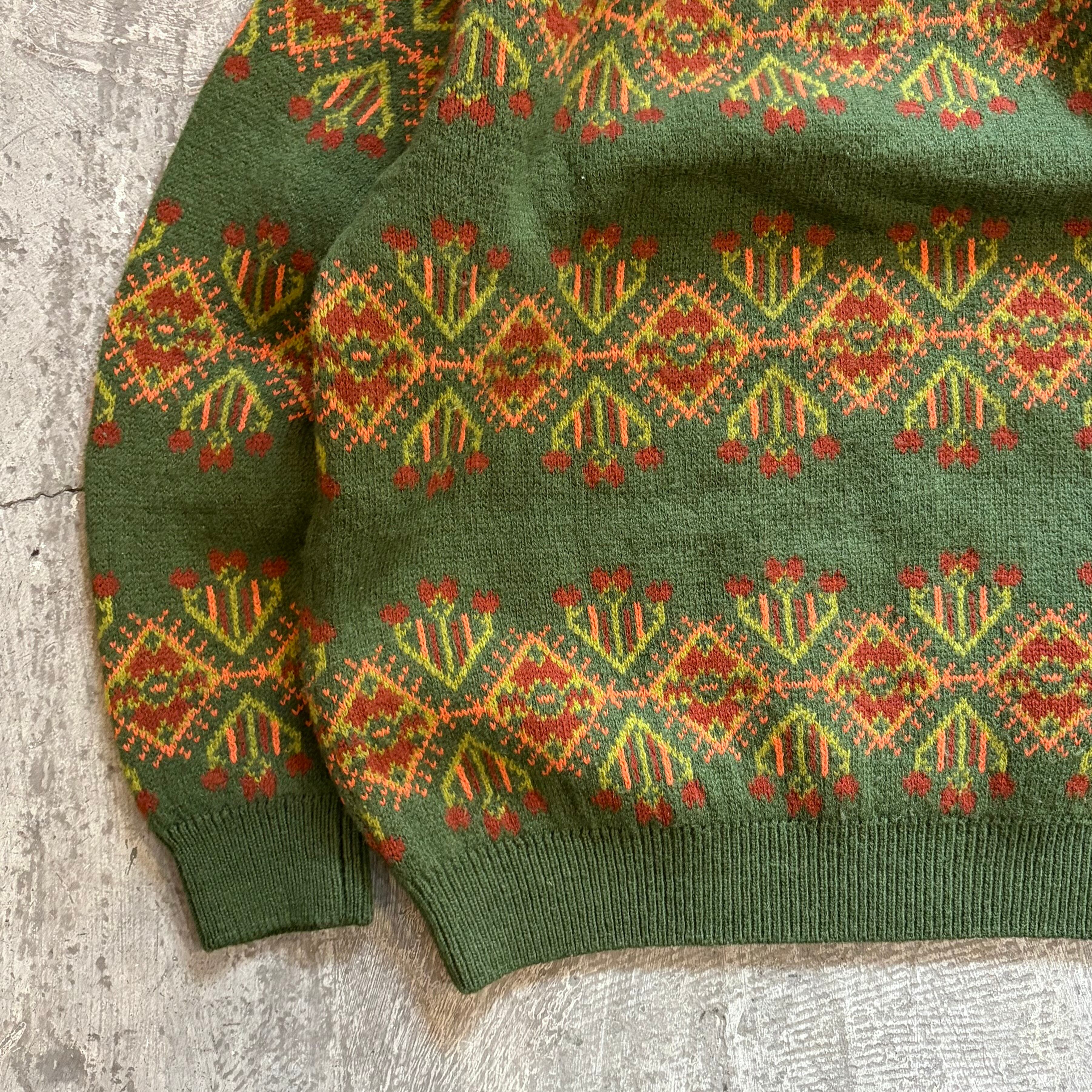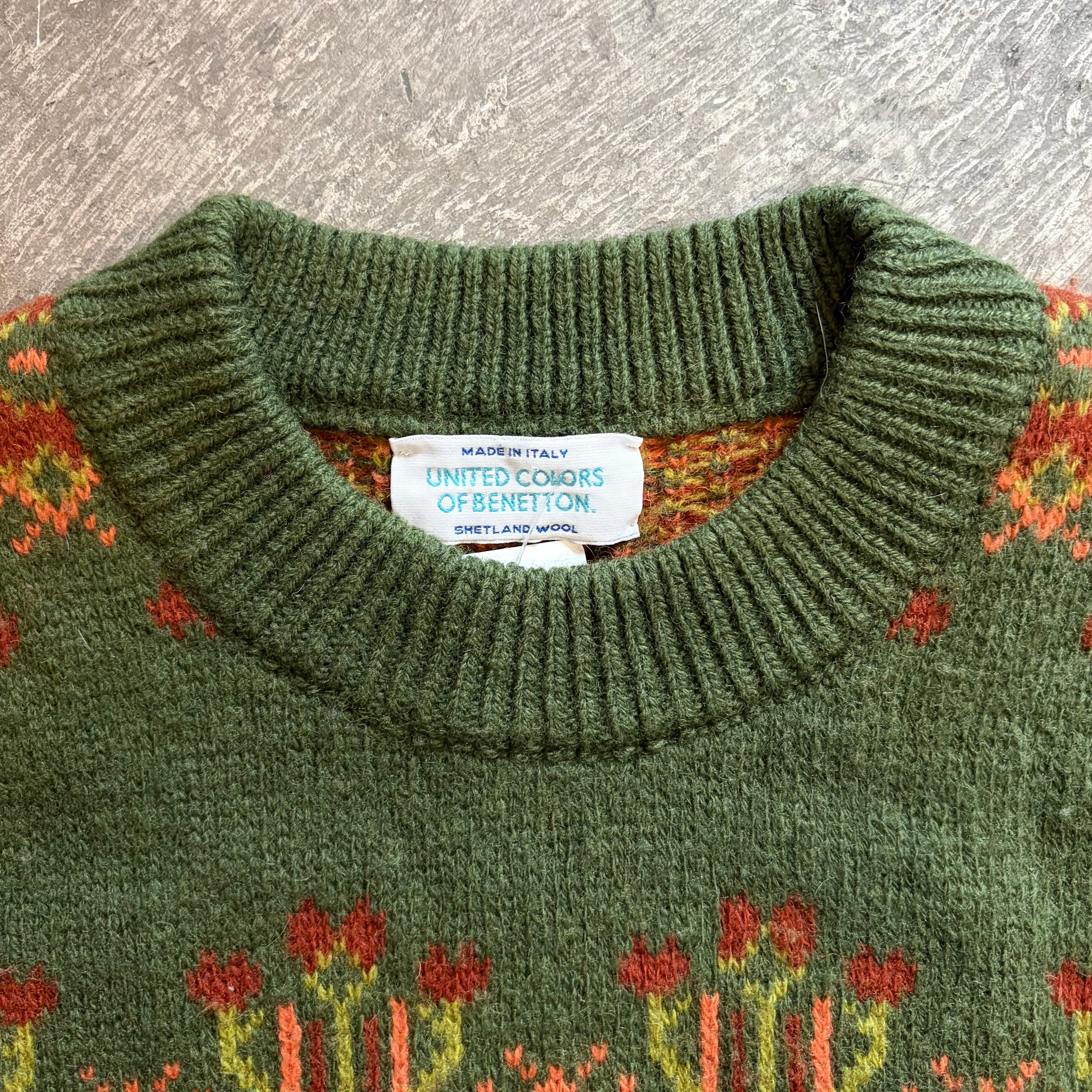 落ち着いた緑に鮮やかなオレンジのカラーが可愛いイタリア製のニットセーターです